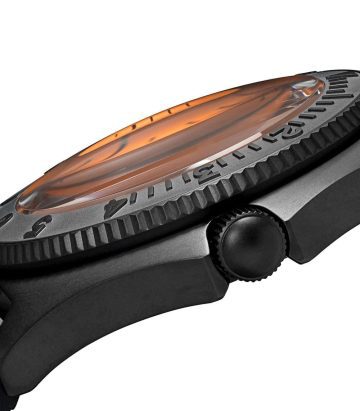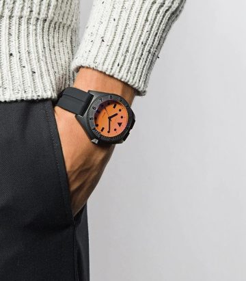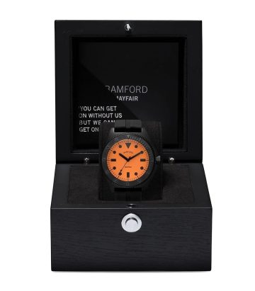 Black Mayfair watch from Bamford Watch Department featuring a rotating bezel, a 40mm stainless steel case, a quartz movement, a rubber strap, luminova indices and a neon orange dial with black accents. This item comes with a gift box.