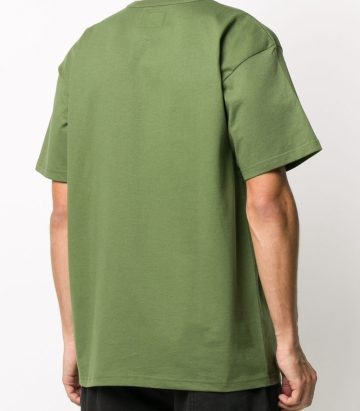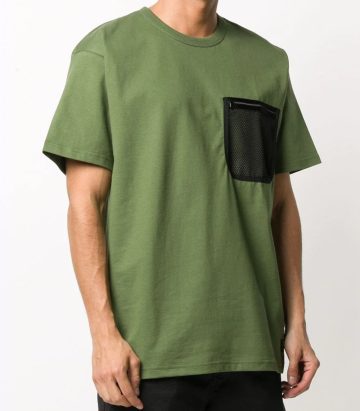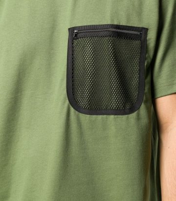 Army green cotton mesh pocket T-shirt from Carhartt WIP featuring a round neck, short sleeves, a relaxed fit, a straight hem and a zipped mesh pocket.
